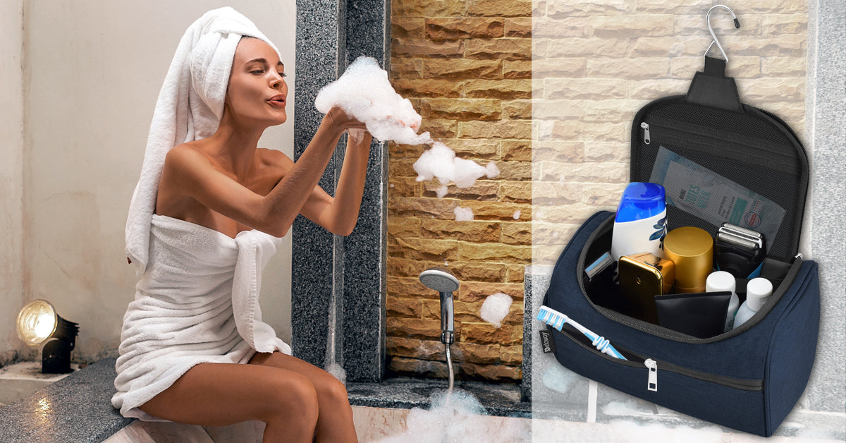 Solltest Du keine Möglichkeit finden, den Kulturtasche am Metallhaken aufzuhängen, kannst Du Ihn dank der verstärkten Böden einfach hinstellen. Die inneren Elastikbänder bieten sicheren Halt für Duschgel und Co!